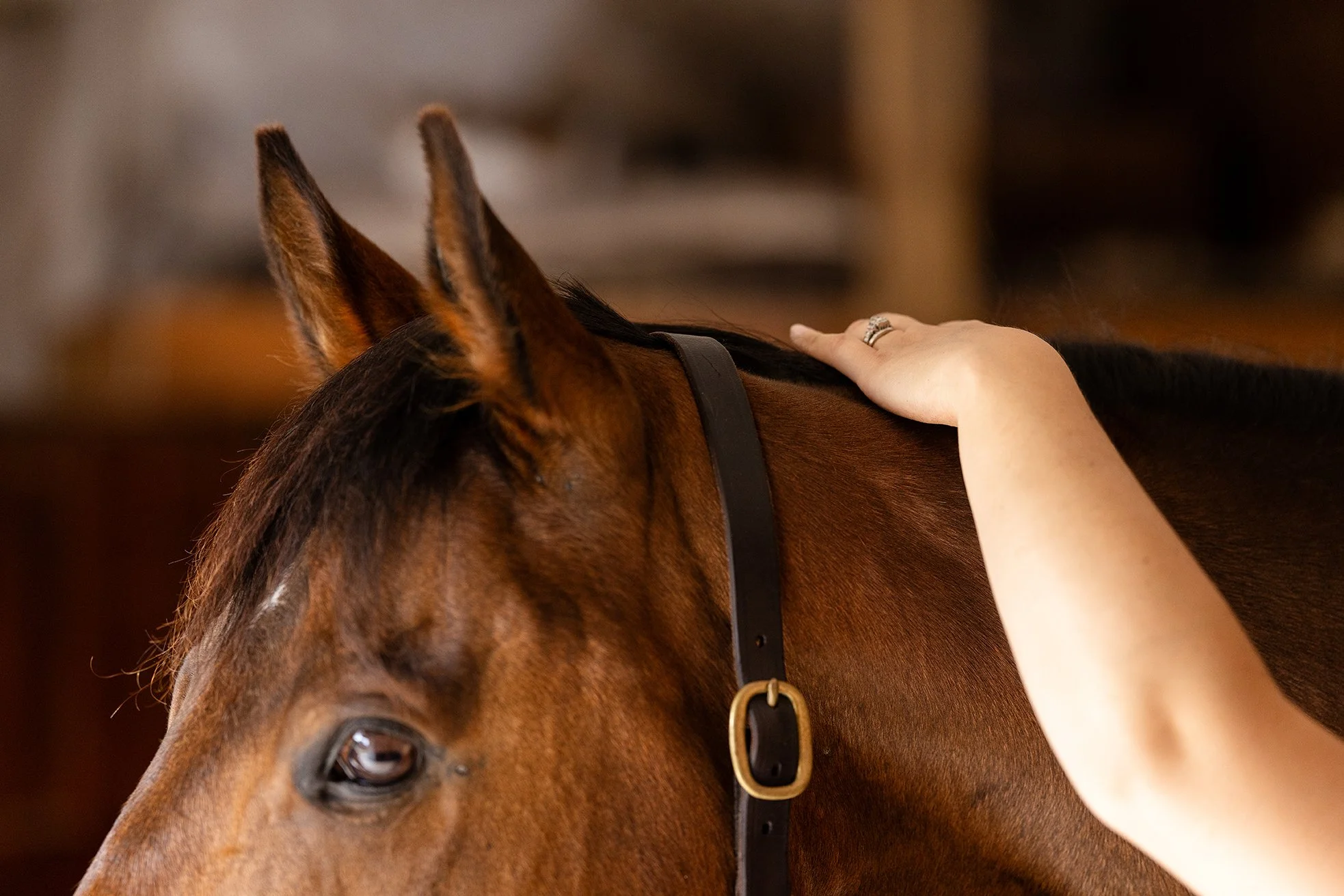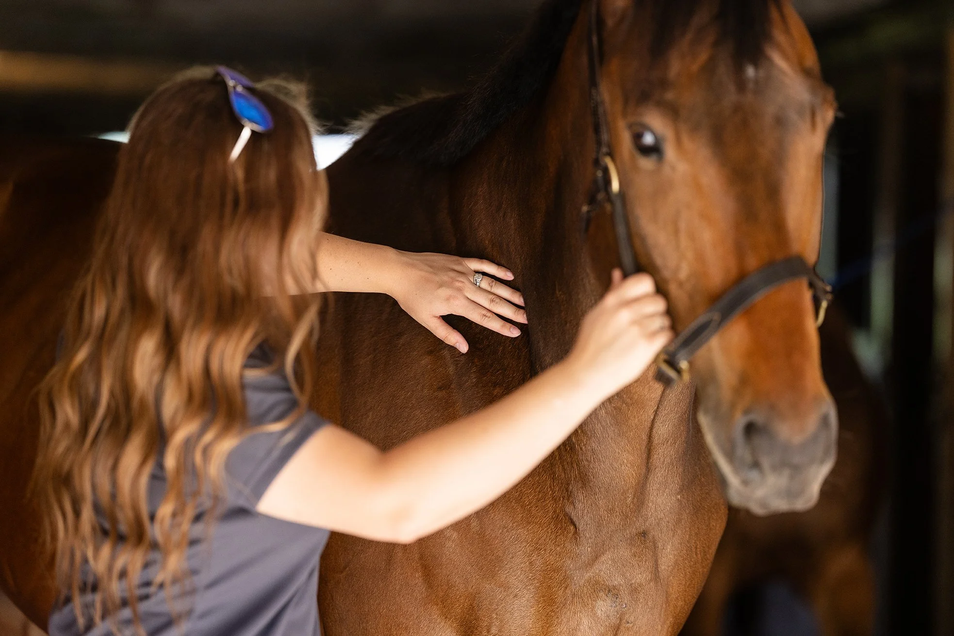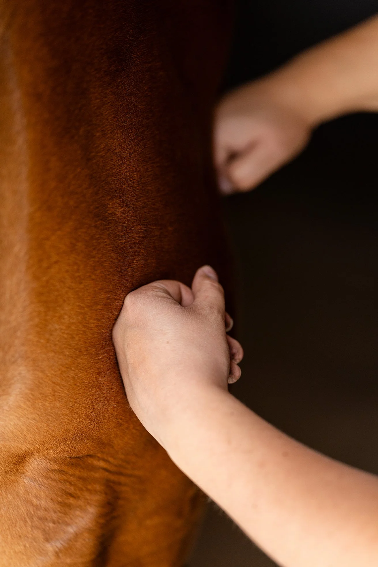 Becki wanted her session to showcase both her skill and the strong bond she shares with her equine clients. We started the day photographing her in action—gently massaging the muscles of a beautiful bay gelding, her hands working intuitively to relieve tension. The setting was ideal: golden sunlight filtering through the barn doors, creating a warm, inviting glow.