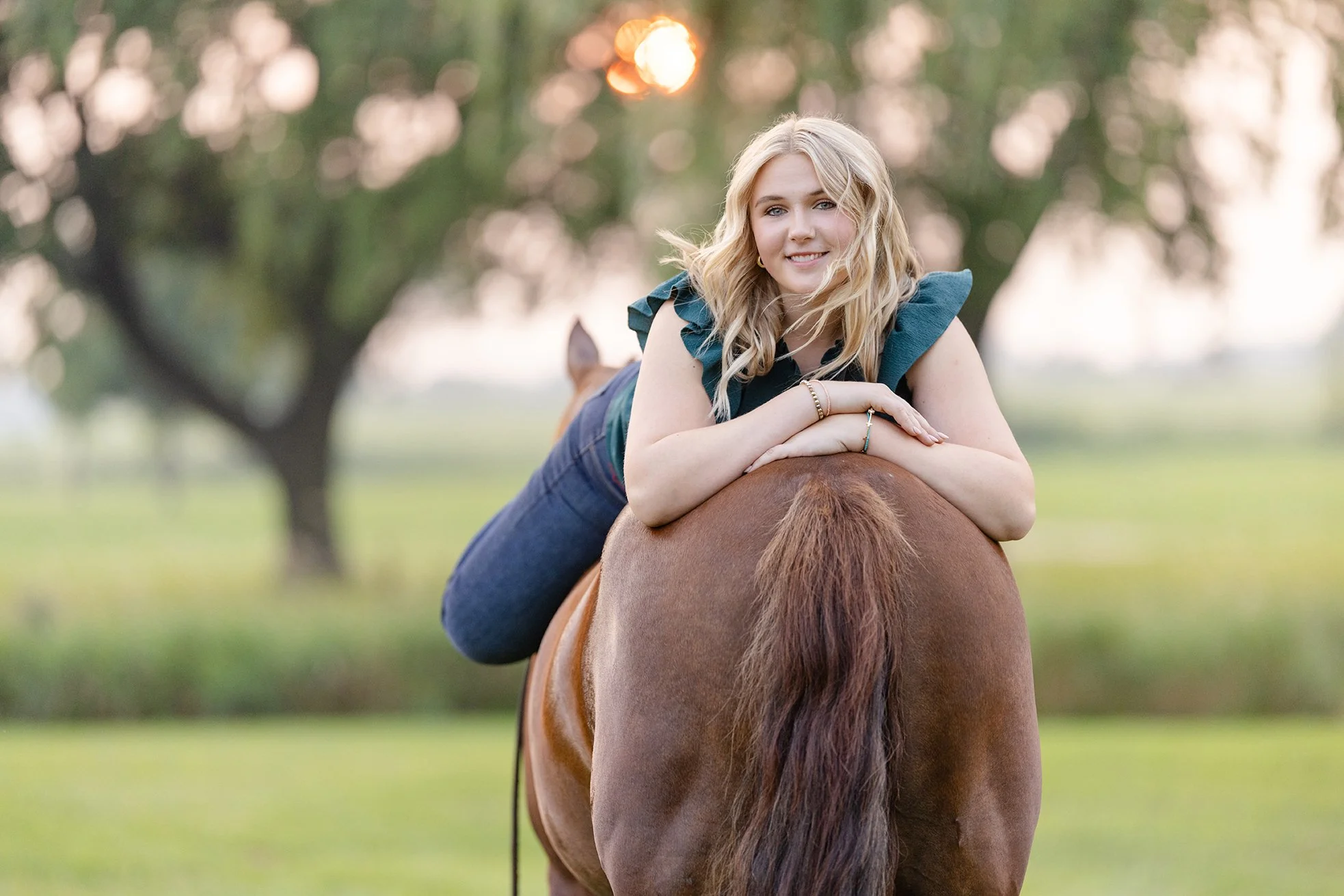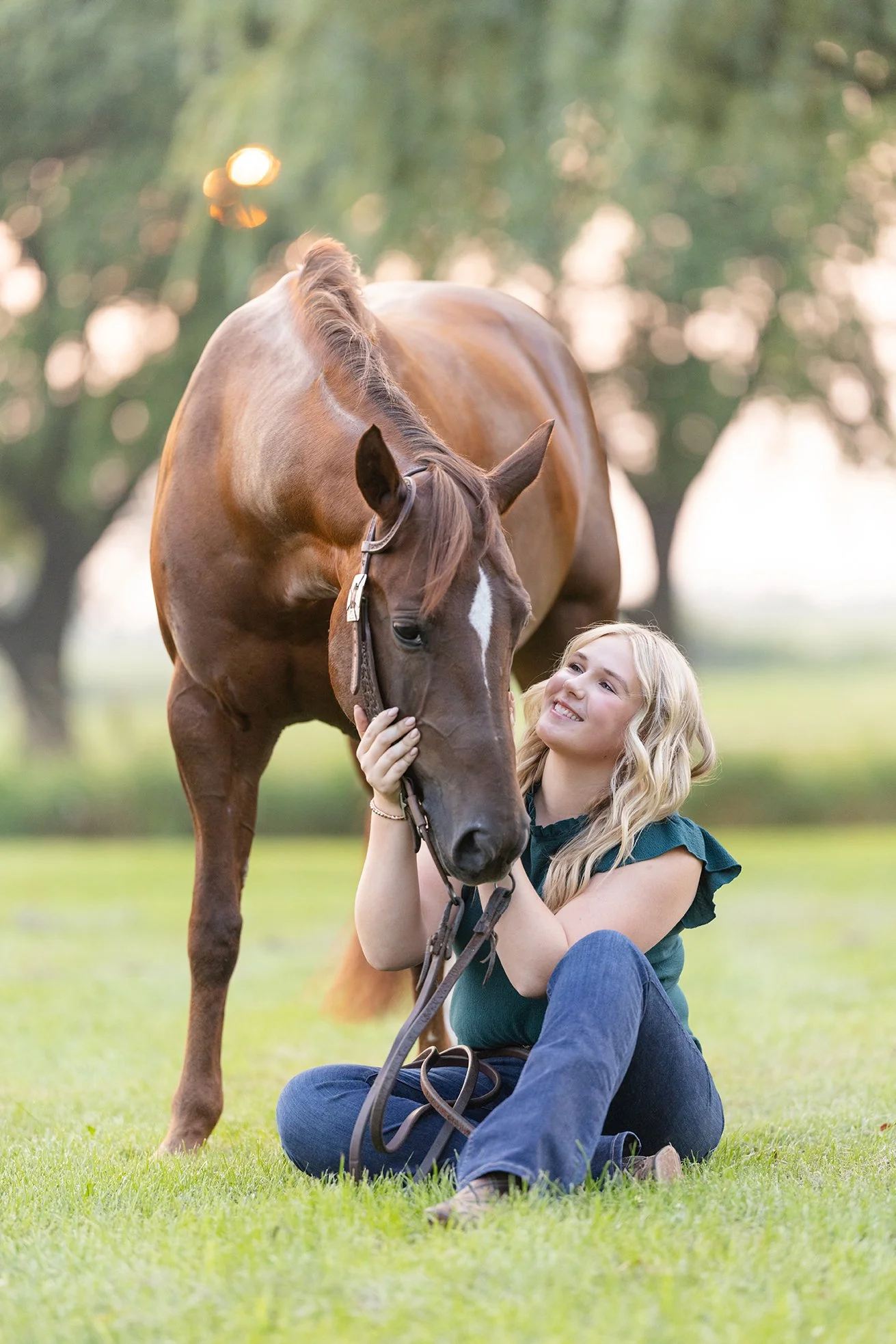 With that win still fresh in their hearts, we set out to capture portraits that reflected the love, trust, and joy between them. The soft evening light wrapped around them beautifully, highlighting Ellie’s teal blouse and Bug’s rich chestnut coat. We started with sweet, quiet moments on the grass, where Bug gently lowered her head into Ellie’s arms. From there, we created classic side-by-side portraits and finished with Ellie lounging bareback on Bug at sunset, a perfect blend of confidence and serenity.