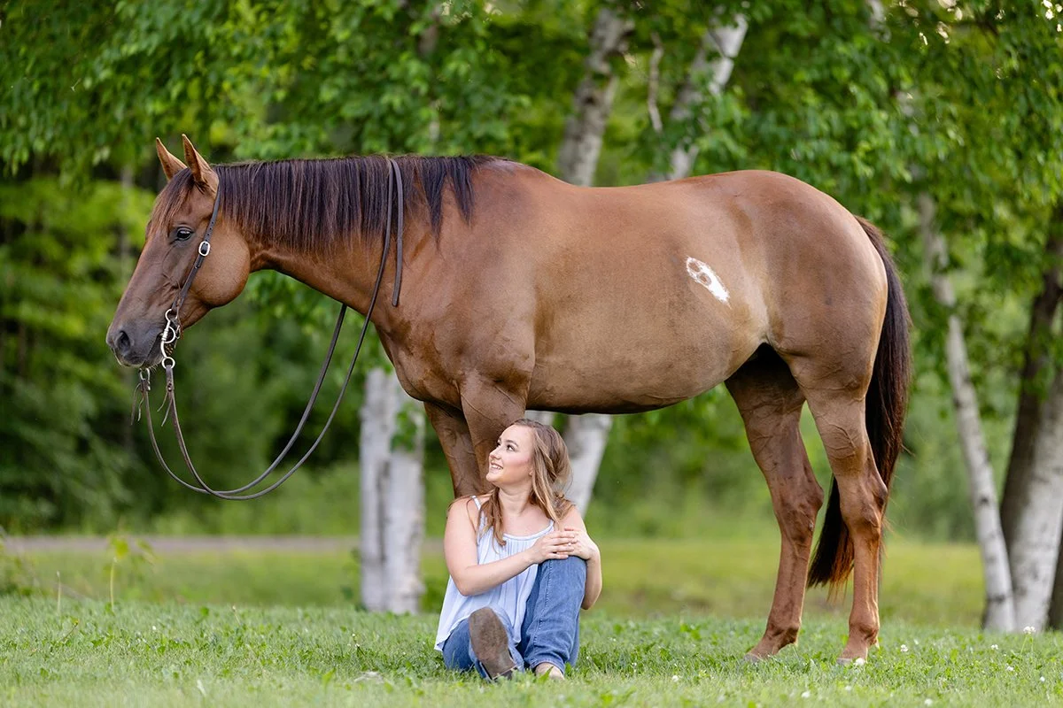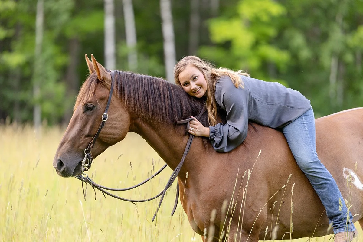 As the sun dipped lower, we headed into the tall grass for quieter portraits. Jaksen climbed onto Nova bareback, resting across her mare with a soft smile. No posing was needed—just an unspoken bond between them. These are the kinds of moments that make equine sessions so meaningful: simple, heartfelt, and real.